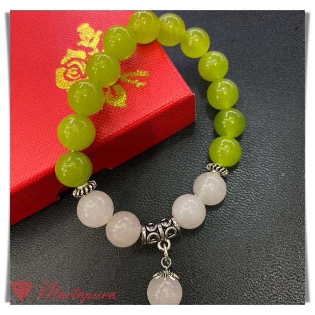 Gelang batu rose quartz mix green aventurine | Ukuran batu 10mm | Model juntai cham | Karet elastis | Ukuran standar dewasa 17-18cm | More info WA 087816003399, WA 081290315050.